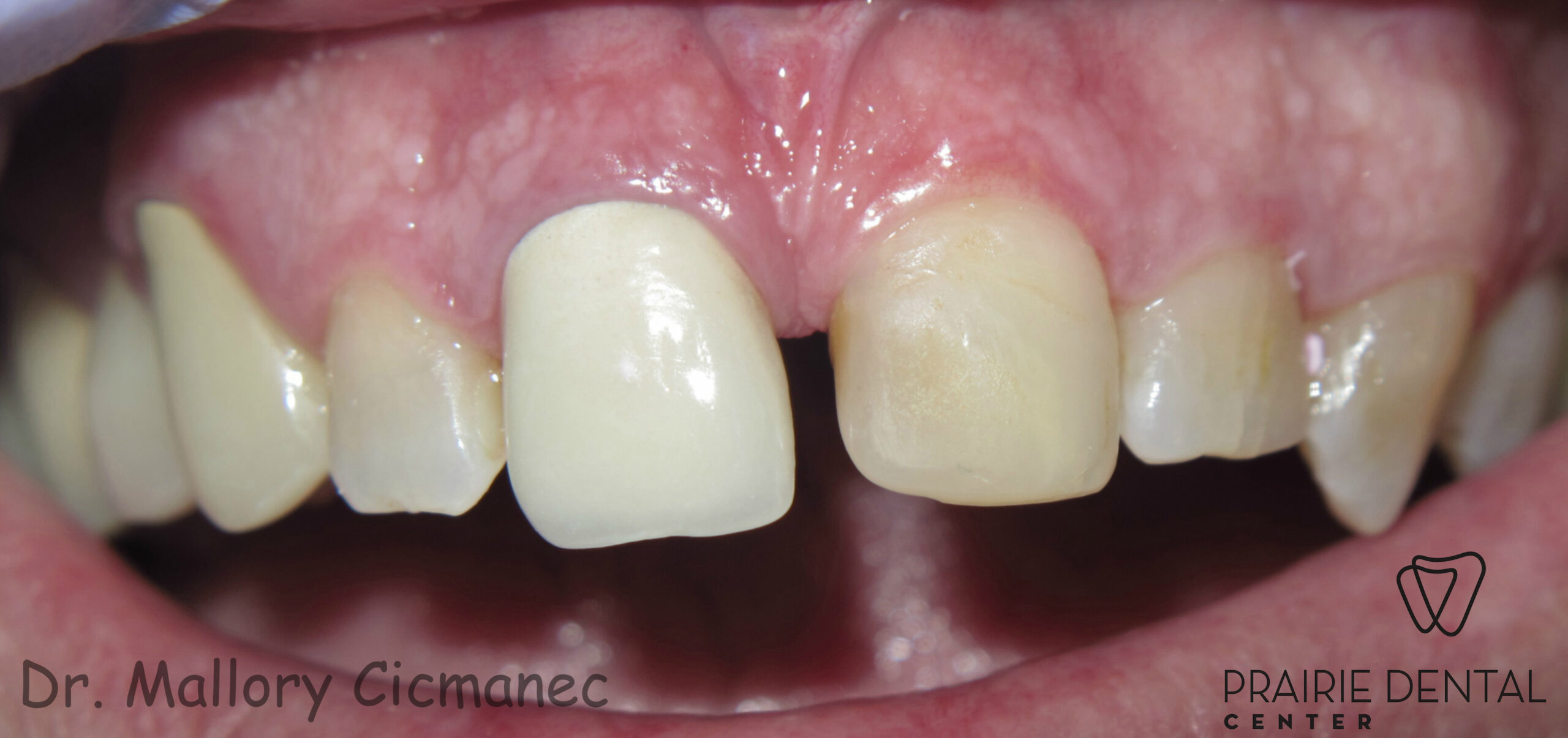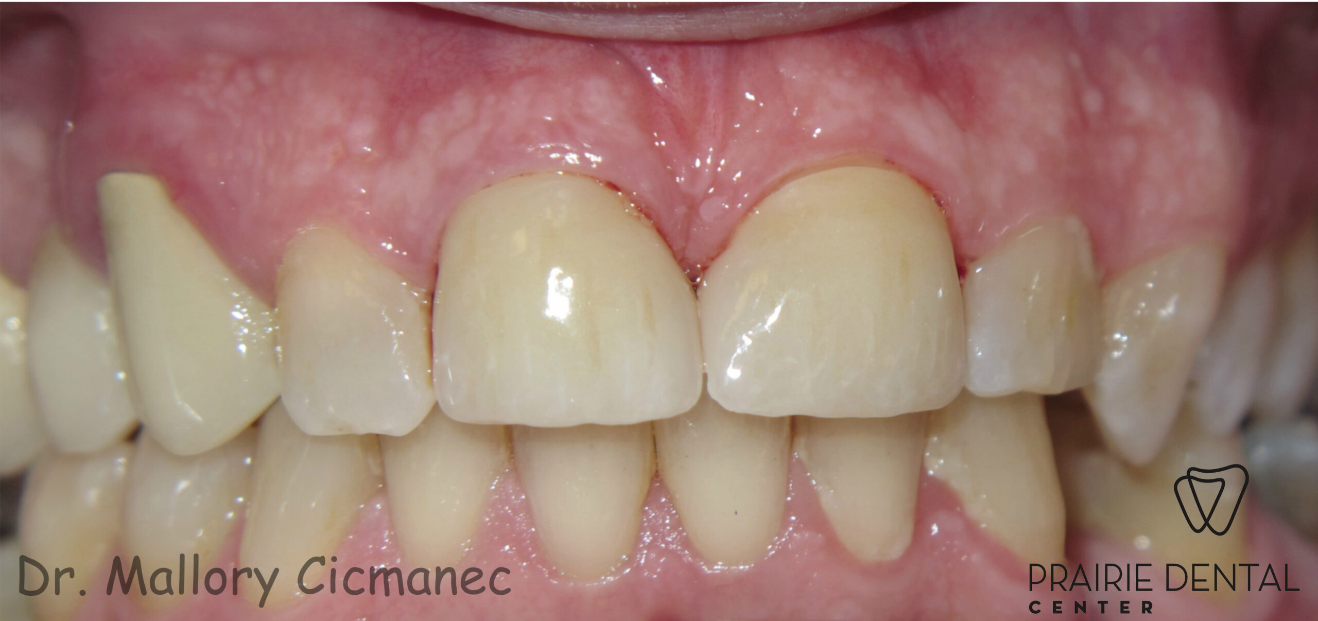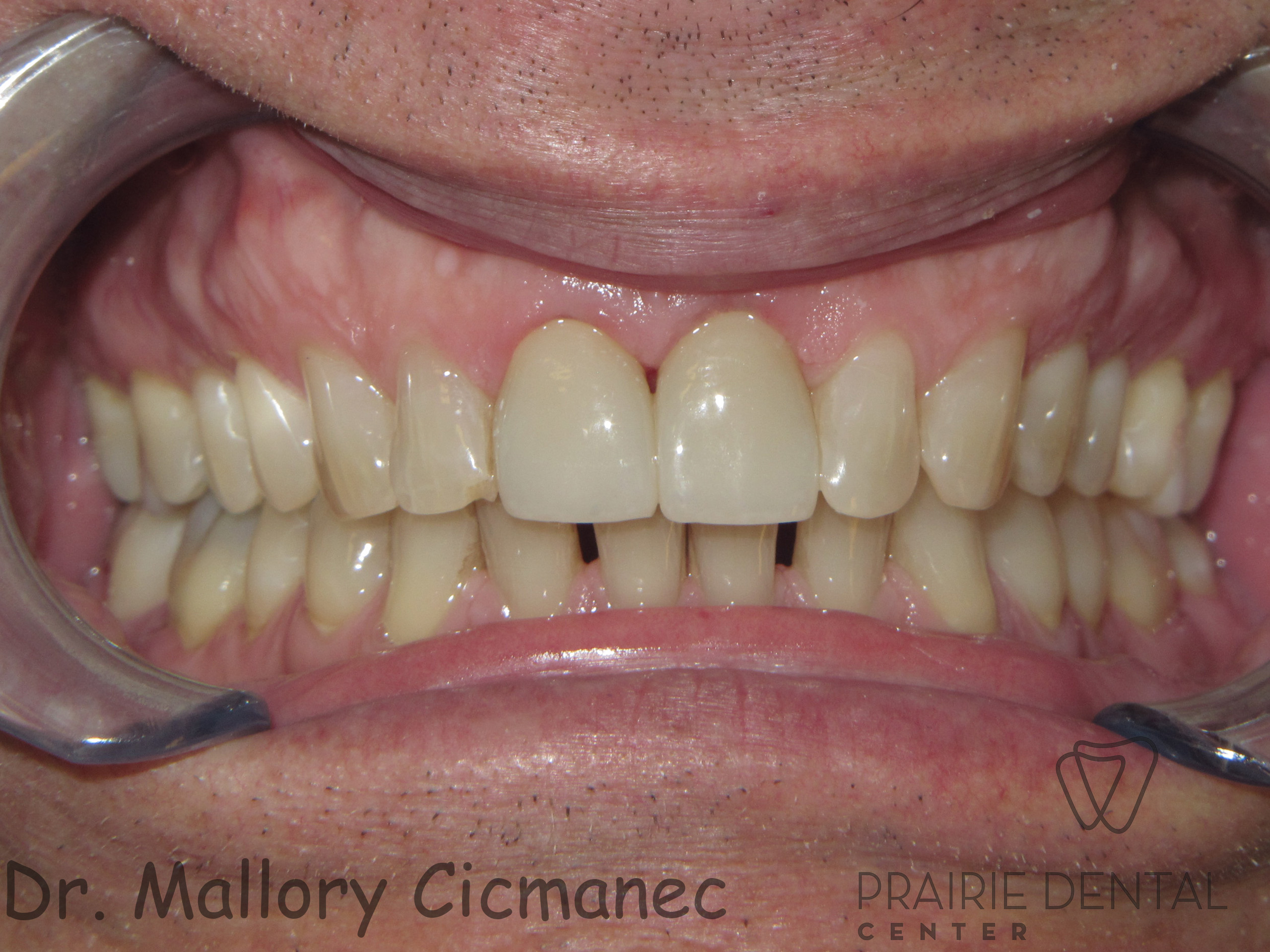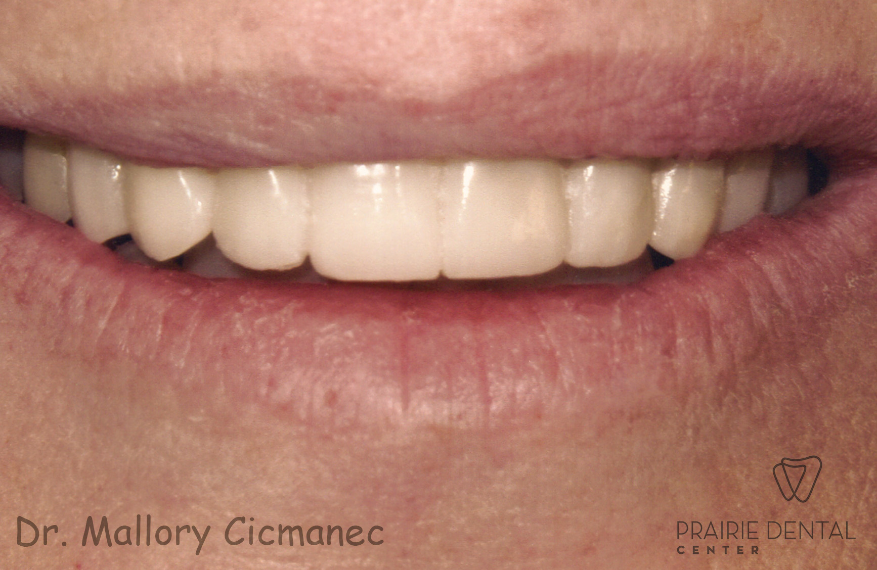 Custom crowns on teeth #7–10 for improved function and a seamless, natural aesthetic.