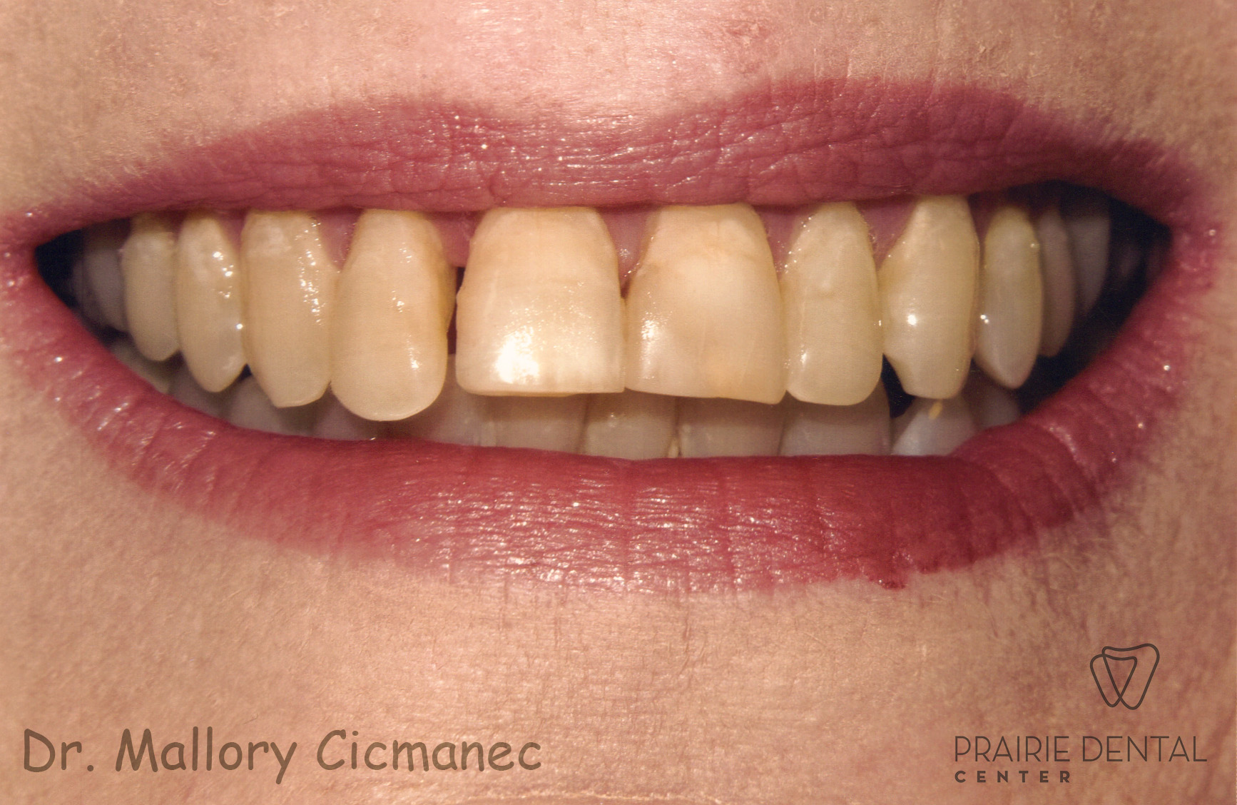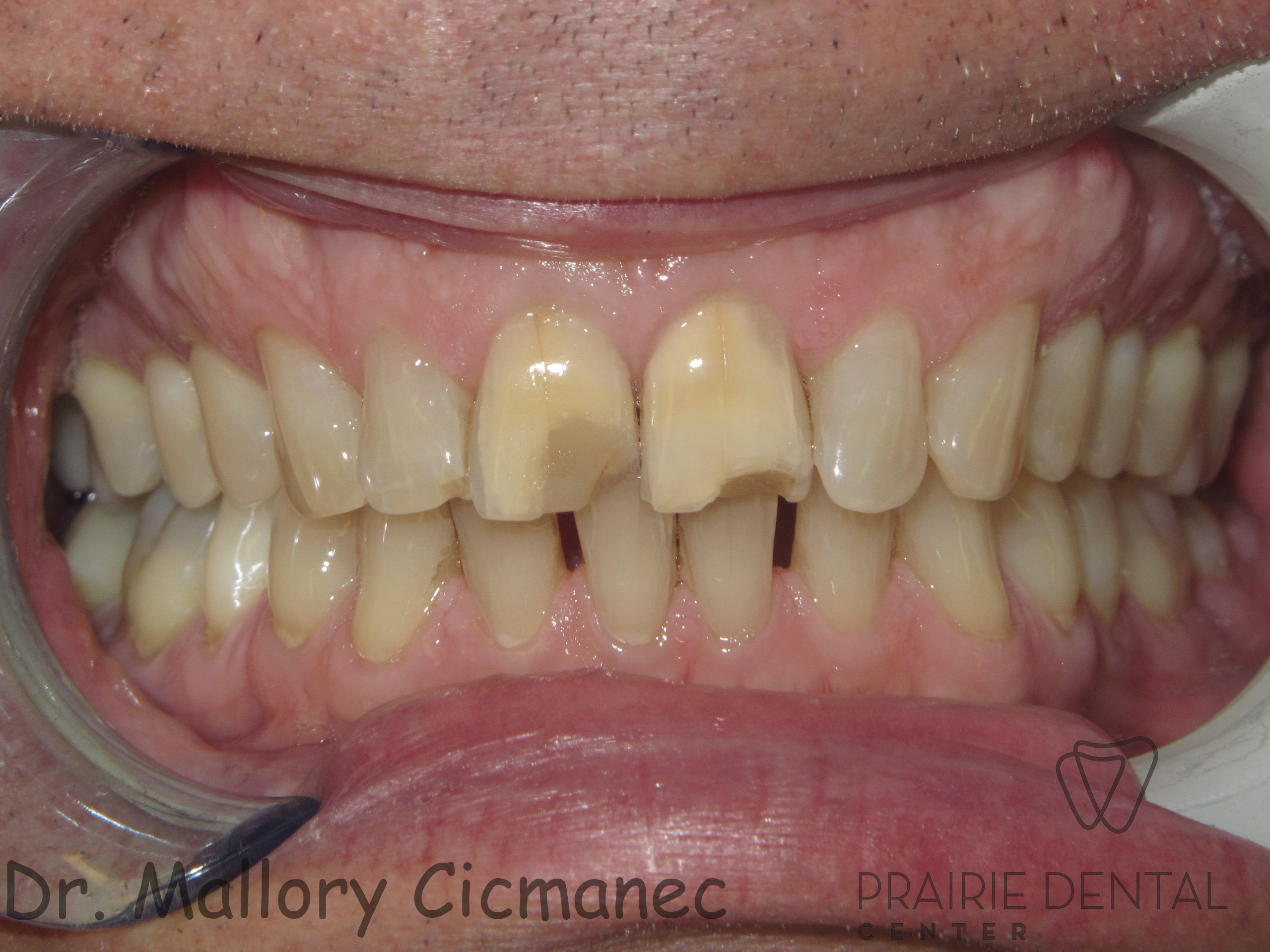 Conservative restorations on teeth #7–10 to repair damage and enhance the appearance of the front teeth.